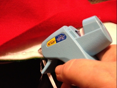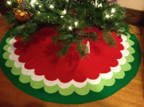 To start with I bought a yard and a half of three colors of felt and two yards of a fourth. I chose dark green for the bottom layer so I got the most of that color. I started with my top layer first. I folded my old Christmas tree skirt in quarters and then did the same with my red felt. I lined them up and using my old tree skirt as my guide, I cut my red felt. I then folded my next layer of felt into quarters and using the red felt I’d just cut I cut my white felt about an inch and a half larger. I repeated this for my last two layers. To make my scalloped edges I used a CD as my guide and marked on my felt with a piece of chalk. You are bound to have two that don’t line up just right use this as the back of the skirt. I scalloped the top three layers and left the bottom layer straight. To make sure everything lined up when I was ready to cut my slit I made sure my awkward spot where the last scallop lines up with the first was on the fold line where the fabric had been folded over to wrap around the bolt. I folded my layers again into quarters and used my CD to cut a circle for the center. I lined the tip of my folded over felt to the hole in the CD to make sure all my layers had the same size hole. Then I unfolded the felt and cut my slit right on the fold line stopping at the middle. To attach the layers together I used a hot glue gun lining up each side of my slit and then the center I glued the edges together. My tree never looked so festive!