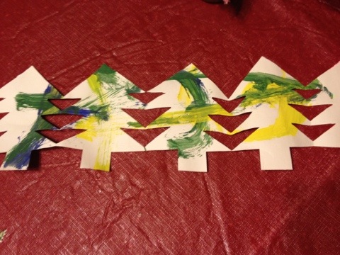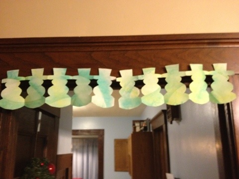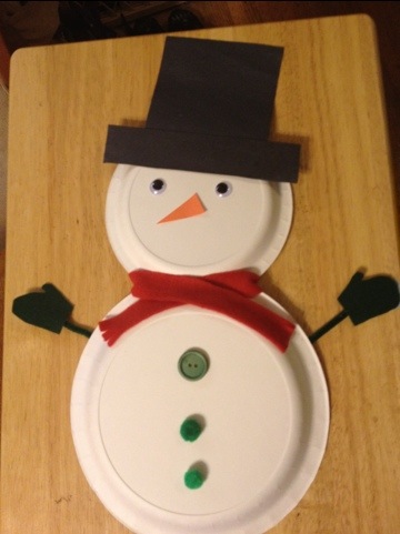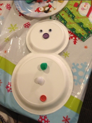 Here’s the breakdown of what I made ahead, what we bought and how it went. First I bought plain white plates in two sizes. The larger plate I cut just a little on one edge so that the smaller plate fit in. I hot glued the two plates together. Then I cut hats and noses out of construction paper. Then I made scarves and mittens out of scraps of felt. I cut pipe cleaners in half and hot glued one mitten to an end of each pipe cleaner. The things I bought and brought with me were buttons, pom poms, and googley eyes. I also provided the kids with glue, tape, ribbon, hole punches, and scissors.