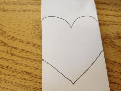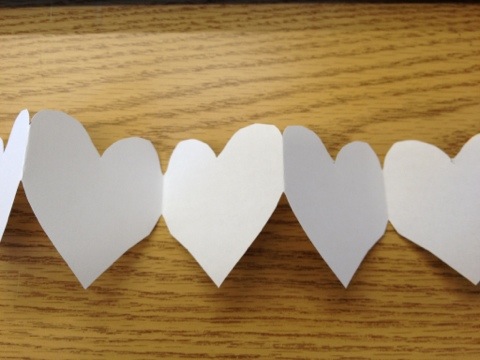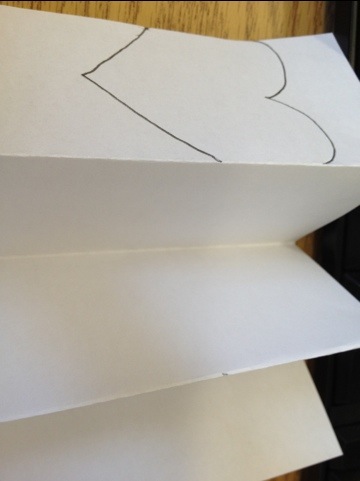 Valentines Day is coming! We are just starting to decorate. Last night we made paper heart chains. Here is how you can make some too. Fold your paper like an accordion. Draw a heart on your paper. You need to leave a portion of your heart on each side open so that the hearts stay connected when you open it up. Cut out the heart. I make multiple chains from each piece of paper and tape them together.