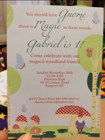 For my son Gabriel’s first birthday party we decided on a magical woodland theme complete with gnomes, fairies, and forest animals. The party was a great success the kids had so much fun! I got a ton of compliments and requests for recipes and directions on how to make some of the fun cool things we had at the party. I will keep adding to this post and I will post separately some of the recipes and directions. I wanted to get some of the pictures posted now just to give an overview of what the party was like. I have many friends and family members who have been anticipating the recipes from the party. I’ve started by posting the menu. The recipes will be linked to the menu as I post them.