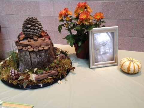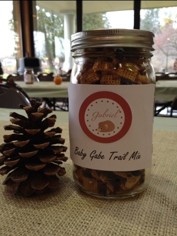 I collected some pictures of Gabriel to have at the party. The decor was all very natural and woodsie. Because it was fall there were small pumpkin gourds. My mother created some natural centerpeices and terrariums using moss and twigs and rocks and pinecones and parts of tree stumps. I brought bowls of pinecones as well as some that were just placed on the tables. I had a few mini pine trees and small pots of mums that I bought at the grocery store that I also put out on the tables. For the tableclothes I used a sage green plastic cloth and on the tables where the guests sat there were burlap table runners.