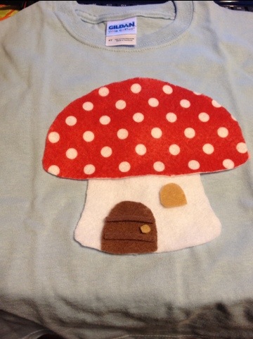 This was big brother Orion’s shirt for the party. This one I did make. I found a printable coloring page online of a gnome house. Orion loves houses. Using my copier at home I copied the image to the size I wanted and then just used it as a pattern to cut out my pieces of felt. This picture just shows the pieces laid out before they were attached by sewing them on.