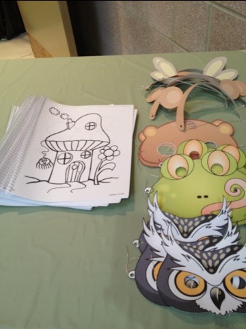 For the party favors I found free printables online and made my own paper party favors. There were owl masks, frog masks, beaver masks, assorted animal ears, homemade coloring books that were made using my moms book binder and not shown in this picture were gnome finger puppets.