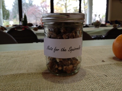 Nuts for the squirrels. On every table I put small mason jars with assorted nuts in them. I printed out labels and hot glued them onto the jars.