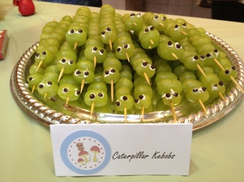 Caterpillar Kebobs were a huge hit. I really look for ways to encourage a good amount of healthy snacking at home and at parties. These cute little guys really paid off. The kids love them and the tray was empty by the end of the party. I just used bamboo shishkebob skewers put the grapes on sideways and added the eyes by using mini chocolate chips and a little frosting.