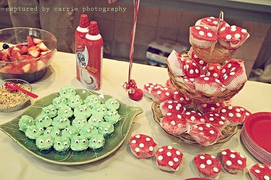 The dessert table. The dessert menu included these toadstool and frog cupcakes as well as a make your own parfait station which I called Fairy Berries and Cream that included yogurt, berries, granolla and whipped cream.