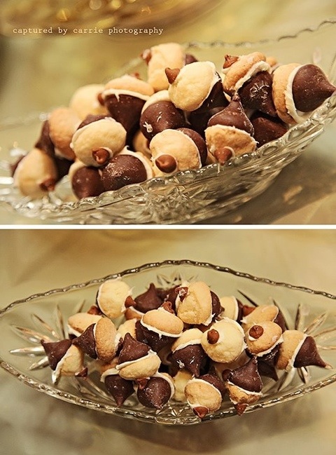 Acorn cookies. These were made to look like acorns using hersheys kisses, small sugar cookies, and mini cinnamon chips.